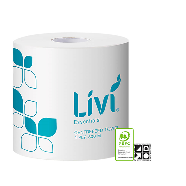 LIVI ESSENTIALS CENTREFEED ROLL TOWEL 1-PLY 300M CARTON 4