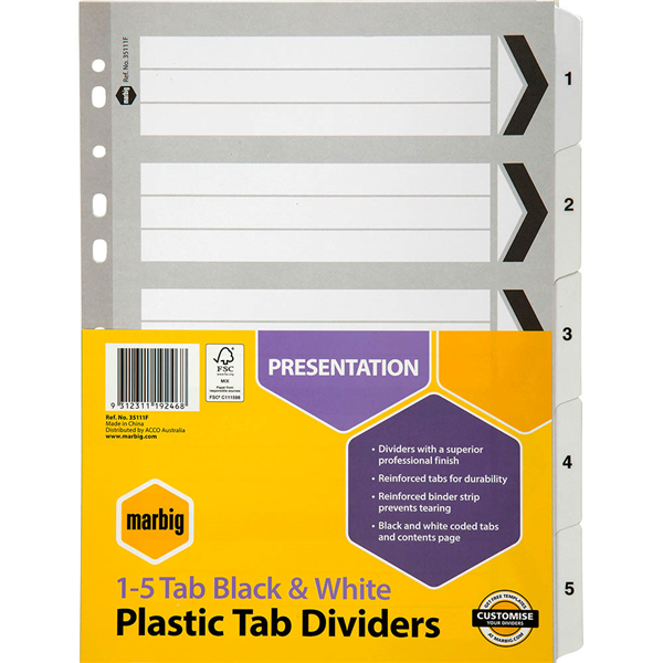 Marbig dividers are made from reinforced manilla board with plastic reinforced tabs and binder strips for durability and longer life