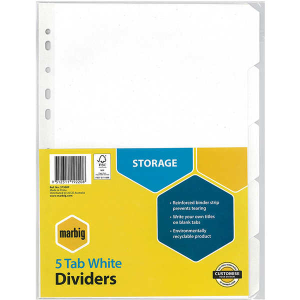 Marbig dividers are made from reinforced manilla board with plastic reinforced tabs and binder strips for durability and longer life