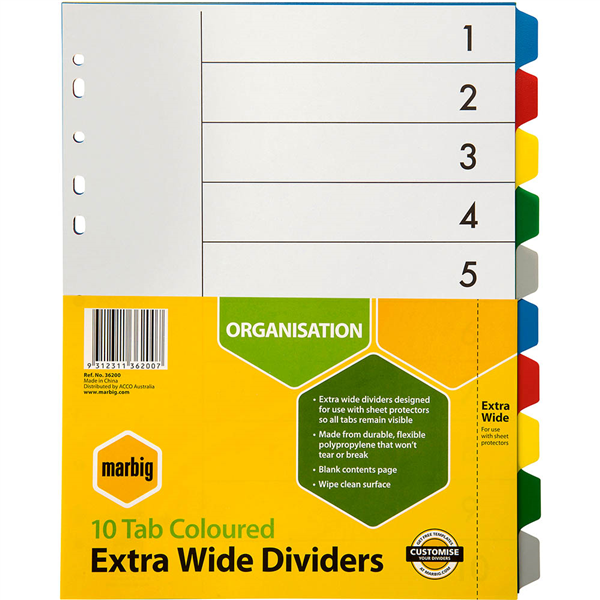 Extra Wide Dividers are 240mm wide and are designed for use with sheet protectors as the tabs extend beyond the edge of the pocket
