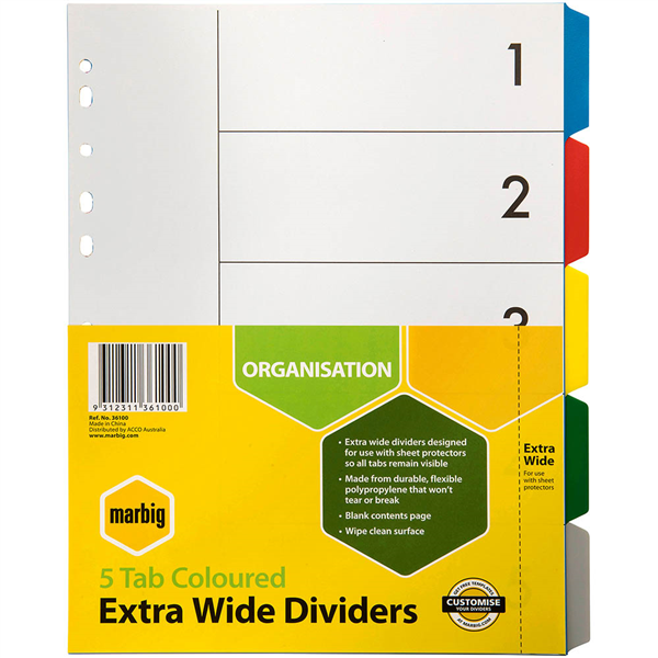 MARBIG EXTRA WIDE DIVIDER PP 5-TAB A4 ASSORTED