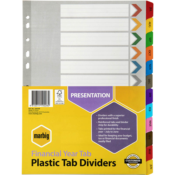 Marbig dividers are made from reinforced manilla board with plastic reinforced tabs and binder strips for durability and longer life