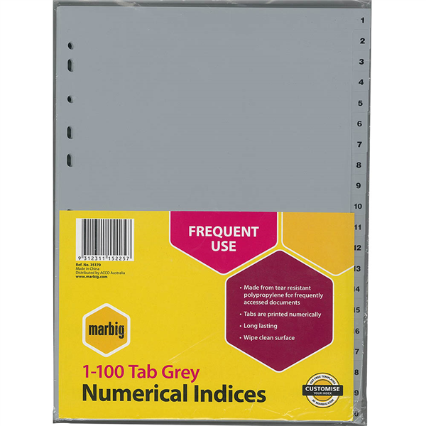 MARBIG INDEX DIVIDER PP 1-100 TAB A4 GREY