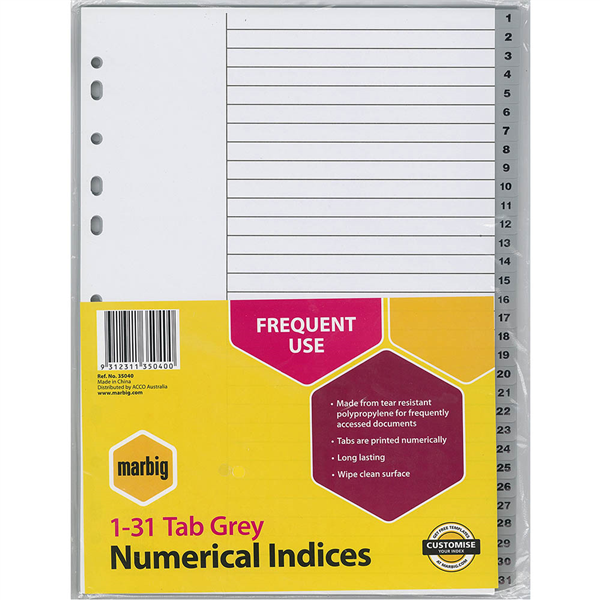 MARBIG INDEX DIVIDER PP 1-31 TAB A4 GREY