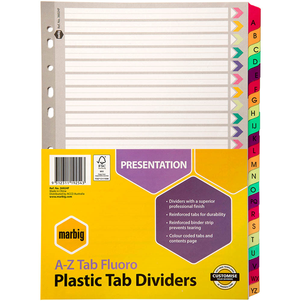MARBIG INDEX DIVIDER REINFORCED MANILLA A-Z TAB A4 FLUORO ASSORTED