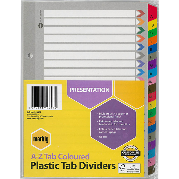 MARBIG INDEX DIVIDER REINFORCED MANILLA A-Z TAB A5 ASSORTED