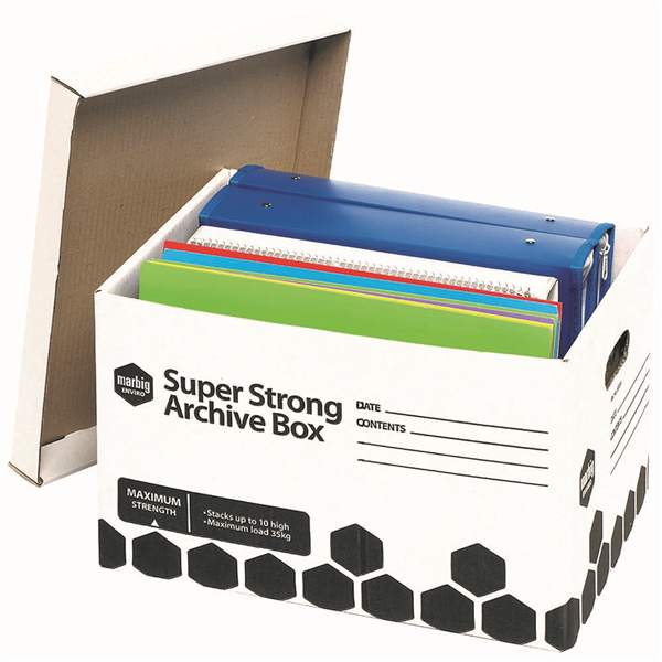 Featuring triple end walls and a double-layer base, it delivers superior strength with the ability to stack up to 10 boxes high safely Its unique Burst Safe design ensures documents wont break through the base when carried, even with heavy loads Perfect for offices, schools, or home storage, each box securely holds foolscap manilla folders, 3 lever arch files, or 6 ring binders, keeping important paperwork organised Proudly Australian made from 100% recycled board, this archive box is also 100% recyclable and supports loads of up to 35kg combining sustainability with unmatched performance How strong is the Marbig Super Strong Archive Box? It supports up to 35kg and can be stacked up to 10 high What documents can it hold? It fits foolscap folders, 3 lever arch files, or 6 ring binders Is it eco-friendly? Yes its Australian made from 100% recycled board and fully recyclable