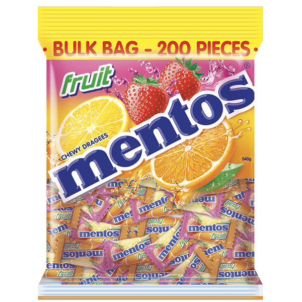 A bulk bag of individually wrapped pieces of fruit Mentos, approx 200 in each bag