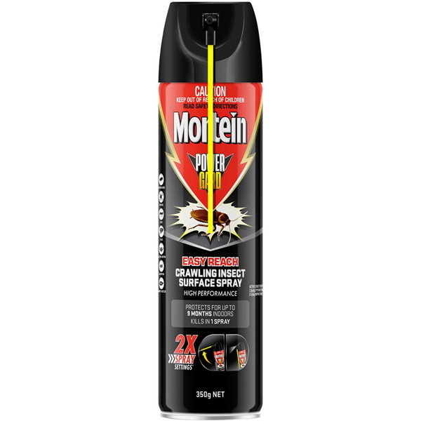 Mortein PowerGard Easy Reach surface spray featuring 2X spray nozzle positions A normal direct spray setting with the extension nozzle folded down and an Easy Reach position with the nozzle extended to spray hard to reach places where insects may hide Spray directly onto insects for a fast kill in 1 spray or spray indoor surfaces to protect your family home for up to 9 months Ideal for use in the kitchen on skirting boards, under cupboards, kitchen appliances, sinks and drawers, around hot water pipes and hot water tanks, on door frames and steps. Also use in the bathroom, toilet, living room, laundry/washing area, bedroom, dining room, in/around bins, storeroom, balcony, around pet beds, under the house and in the roof in locations where cockroaches commonly hide Kill crawling insects in 1 spray Help you kill insects where they hide in hard to reach places 2X spray settings - direct and easy reach setting Kills cockroaches, spiders, ants, fleas, clothes moths, silverfish, carpet beetles Protects your family home from crawling insects for up to 9 months indoors