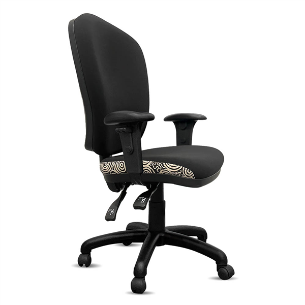 Featuring a wider seat for enhanced seating comfort, as well as an eco-friendly back for superior back comfort These AFRDI rated load chairs with arms are perfect for education spaces, universities, or any office areas with indigenous fabric and black commerical fabric upholstered Heavy duty commercial chair with 3 lever mechanism and ratchet back height adjustment Scallop arm pad on top for height adjustable arms to rest with very strong and durable button locking system Heavy duty gas lift cylinder Base: 5 way 700mm commercial grade nylon base Moulded seat foam for supreme comfort Fire retardant contoured moulded foam A unique commercial fabrics designed by Nelly Patterson (Indigenous Artist) combined with K2 black fabric to upholster the chair