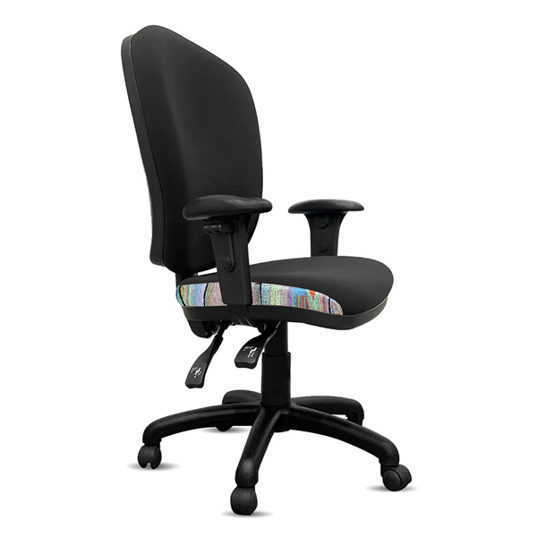 Featuring a wider seat for enhanced seating comfort, as well as an eco-friendly back for superior back comfort These AFRDI rated load chairs with arms are perfect for education spaces, universities, or any office areas with indigenous fabric and black commerical fabric upholstered Heavy duty commercial chair with 3 lever mechanism and ratchet back height adjustment Scallop arm pad on top for height adjustable arms to rest with very strong and durable button locking system Heavy duty gas lift cylinder Base: 5 way 700mm commercial grade nylon base Moulded seat foam for supreme comfort Fire retardant contoured moulded foam A unique commercial fabrics designed by Nelly Patterson (Indigenous Artist) combined with K2 black fabric to upholster the chair