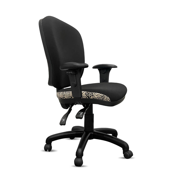 Featuring a wider seat for enhanced seating comfort, as well as an eco-friendly back for superior back comfort These AFRDI rated load chairs with arms are perfect for education spaces, universities, or any office areas with indigenous fabric and black commerical fabric upholstered Heavy duty commercial chair with 3 lever mechanism and ratchet back height adjustment Scallop arm pad on top for height adjustable arms to rest with very strong and durable button locking system 5 way 700mm commercial grade nylon base Heavy duty gas lift cylinder Moulded seat foam for supreme comfort Fire retardant contoured moulded foam A unique commercial fabrics designed by Nelly Patterson (Indigenous Artist) combined with K2 black fabric to upholster the chair