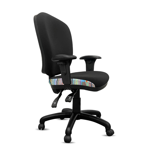 Featuring a wider seat for enhanced seating comfort, as well as an eco-friendly back for superior back comfort These AFRDI rated load chairs with arms are perfect for education spaces, universities, or any office areas with indigenous fabric and black commerical fabric upholstered Heavy duty commercial chair with 3 lever mechanism and ratchet back height adjustment Scallop arm pad on top for height adjustable arms to rest with very strong and durable button locking system 5 way 700mm commercial grade nylon base Heavy duty gas lift cylinder Moulded seat foam for supreme comfort Fire retardant contoured moulded foam A unique commercial fabrics designed by Nelly Patterson (Indigenous Artist) combined with K2 black fabric to upholster the chair
