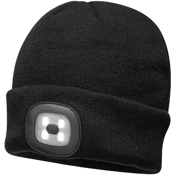 This warm and comfortable acrylic beanie hat features a removable LED front light for superior visibility in low light conditions The rechargeable LED can be charged in a USB port