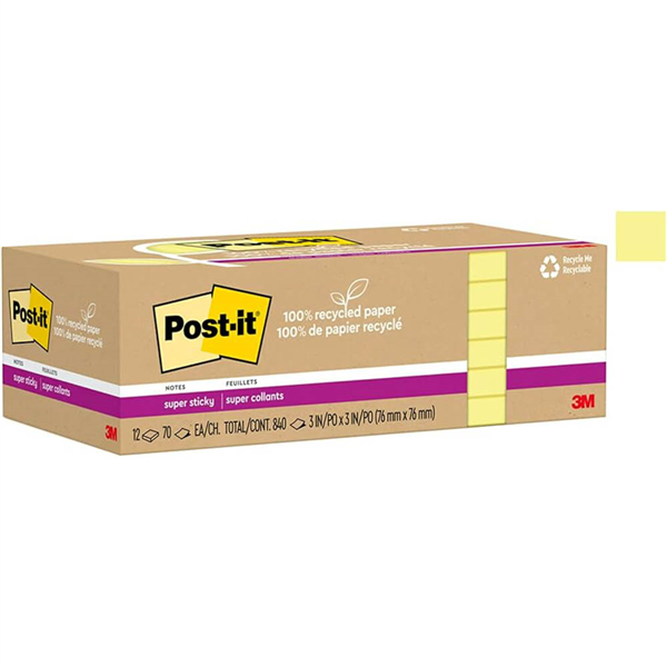 POST-IT 654R-12SSCY SUPER STICKY NOTES 76 X 76MM RECYCLED CANARY YELLOW PACK 12