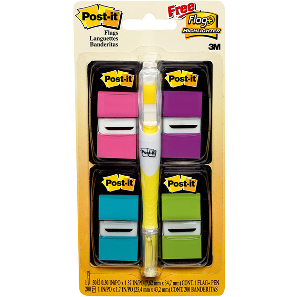 All Post-it Flag Value Packs contain a FREE product to try Assorted coloured flags are perfect for temporary flagging of documents, articles, books, and folders Easy to write on with most writing instruments, Post-it Flags stick securely and remove cleanly Great to bookmark reading material Stays where you place them and repositions as you need to For use as a stand-alone or in a sleek dispenser Make it simple to mark, flag or highlight important information Sticks securely, removes cleanly without damage Easy to Write on Colour code your organisation with multiples colours per pack! FREE Post-it Flag+ Highlighter