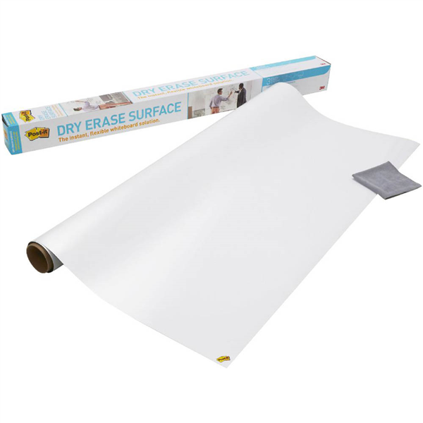 Post-it Dry Erase Surface is designed to stick to a variety of painted drywall and steel surfaces, glass, finished wood, and existing whiteboards or chalkboards