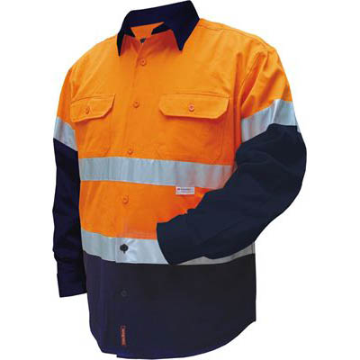 PRIME MOVER MF101 COTTON DRILL SHIRT FLAME RETARDANT WITH REFLECTIVE TAPE 2-TONE ORANGE NAVY MEDIUM