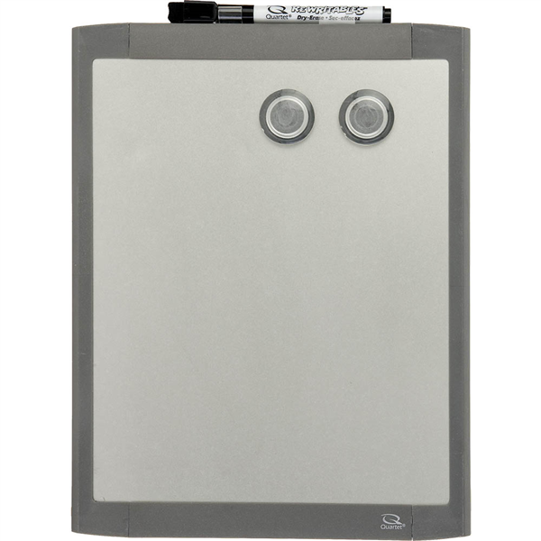 Stainless steel finish magnetic dry-erase board doubles as a magnetic bulletin board Sleek, modern design looks good in the home or office Plastic, graphite grey frame complements silver colour dry-erase board surface Flexible mounting allows vertical or horizontal mounting Permanent self-stick pads and magnets included for easy, secure mounting