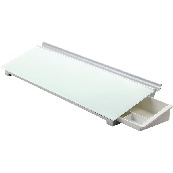 Notepad design sits neatly on your desktop for easy access Jot down a to-do list and easily refer back to it while you work Durable glass dry-erase surface will not stain or ghost for clean erase after every use White glass computer pad is infinitely reusable and replaces the need for scrap paper Frameless design is sleek and attractive Compact size allows computer pad to fit neatly in between monitor and keyboard Glass computer pad is slanted upward for easy reading and writing of notes and reminders Storage drawer holds sticky notes and other small accessories Accessory channel holds dry-erase markers and pens