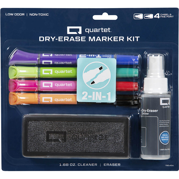 Quartet whiteboard accessory kit provides everything you need to keep your dry erase board in tip-Top shape Display your writing with strong bold color every time The distinct bright ink helps ensure that your message is communicated both clearly and effectively DryGuard prevents ink from drying out, even if left uncapped up to two days Create either thick or thin lines with the versatile chisel point. The multipurpose point allows you All items in kit are suitable for use on any quartet dry erase board 4 x Quartet 2-In-1 whiteboard markers (8 colours), 1 x whiteboard eraser, 1 x 50ml whiteboard cleaner Create thin lines with the fine point tip The precise lines are perfect for clear, distinct handwriting Quickly move from one project to the next with these easy to erase markers. Don't fuss with caked on The non-toxic, low odor ink is perfect for any environment, such as classrooms, offices and homes