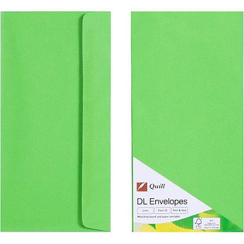 QUILL DL COLOURED ENVELOPES PLAINFACE STRIP SEAL 80GSM 110 X 220MM LIME PACK 25