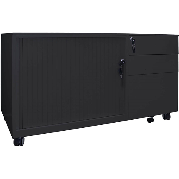 The unit is fully lockable and has a Flush Front mobile pedestal and a Tambour door section with a centre shelf Comes in left or right hand options Foolscap Size Files Run East To West In File Drawer A4 Size Files Run North To South In File Drawer Heavy Duty Hard Floor Castors Ball Bearing Runners Anti-Tilt Backed By a 10-year warranty