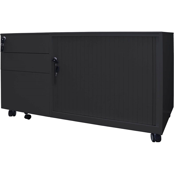 The unit is fully lockable and has a Flush Front mobile pedestal and a Tambour door section with a centre shelf Comes in left or right hand options Foolscap Size Files Run East To West In File Drawer A4 Size Files Run North To South In File Drawer Heavy Duty Hard Floor Castors Ball Bearing Runners Anti-Tilt Backed By a 10-year warranty