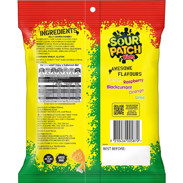 Flood your mouth with delicious fruit flavoured lollies covered in a sour then sweet blast! SOUR PATCH KIDS lollies are fun, soft, and chewy treats; beloved by kids, teenagers, and adults.