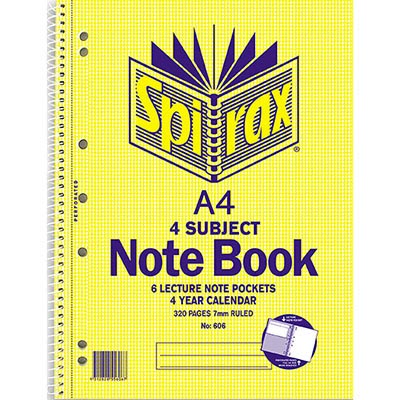 Spirax subject books are great for the office or school. The pages of the notebook are divided into sections or subjects by the use of pocketed cardboard dividers. All of the A4 Subject Note Books are seven hole punched for use in 2, 3 and 4 ringed binders