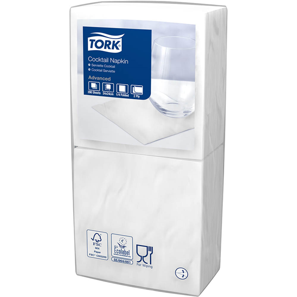 Tork 2-ply cocktail napkins are the perfect size for any function or event Super soft and thick napkin Perfect size cocktail napkins complements the bar and the serving of savories Enhance your customers dining experience Perfect size for any function or event Sharp edge emboss designed to impress your guests