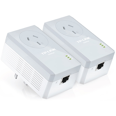 With advanced HomePlug AV technology, the TL-PA4010PKIT can provide users with a stable high-speed data transmission rates of up to 500Mbps over a household electric circuit for up to 300 meters. the TL-PA4010PKIT is a great choice for a whole home solution to connect all network compatible devices--from computers and game consoles to set-top boxes for IPTV to printers and NAS hard drives With its Integrated Mains Filter, the TL-PA4010PKIT can optimize powerline communication performance by suppressing noise interference generated by surrounding electronic equipment that can affect network performance. That means that users wont experience a sudden speed drop when a larger power consuming device is plugged into the power socket You can set up a hassle-free Powerline network within minutes with TP-LINKs powerline adapters, just plug in and play. Also, the adapters Pair buttons can be utilized for securing or managing multiple powerline adapters in your home powerline network - 1. Plug one Internet connected adapter into a nearby power outlet - 2. Connect additional adapters to PCs/laptops/Internet TVs or other networked devices via an Ethernet cable - and you're done! With its integrated power socket, the new TL-PA4010PKIT provides real convenience for your home network. The integrated power socket allows an additional device or power bar to be connected to the adapter as though it were a normal wall socket. This ensures that even with the TL-PA4010PKIT plugged in, no power outlet is going to waste The TL-PA4010PKIT, a new-generation of Powerline Adapter, with its practical product design and environment-conscious Power-Saving Mode, will automatically switch from its regular Working Mode to Power-Saving Mode that will reduce energy consumption by up to 85% Data transmission rates up to 500Mbps over electrical wires, ideal for HD video streaming Integrated power socket making sure that no power outlet is going to waste Plug and play design and easy encryption on a push of pair button Power-Saving Mode automatically reduces power consumption by up to 85%