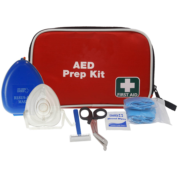Automated External Defibrillator Preparation kit, comprising a proper surgical razor designed to cope with tough hair, trauma shears for cutting clothing, wound wipe, 1 pair of nitrile gloves, and a resuscitation mask of premium quality