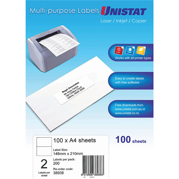 UNISTAT 38938 MULTI-PURPOSE LABEL 2UP 148 X 210MM WHITE PACK 100