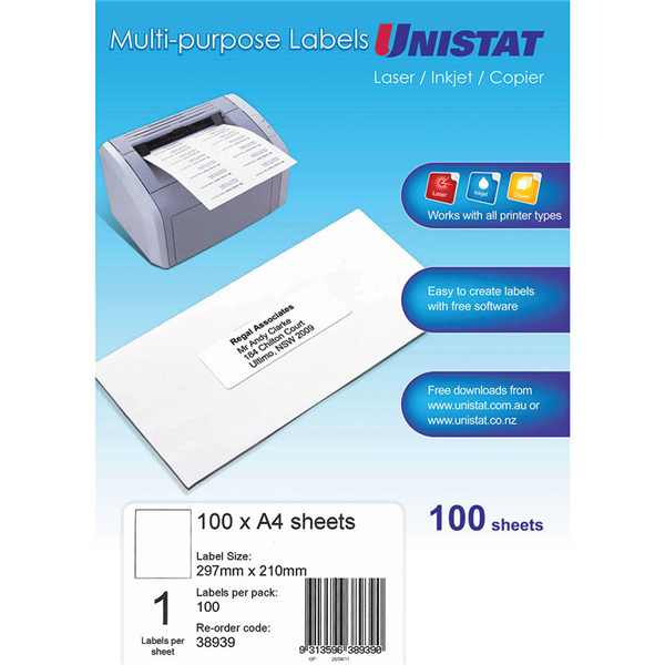Use Unistat labels in your laser printer, inkjet printer or copier Select from a full range of mailing and parcel label sizes Ideal for addressing and other applications Suitable for laser printers, inkjet printers and copiers Self-adhesive ensures labels stay secure Natural white finish