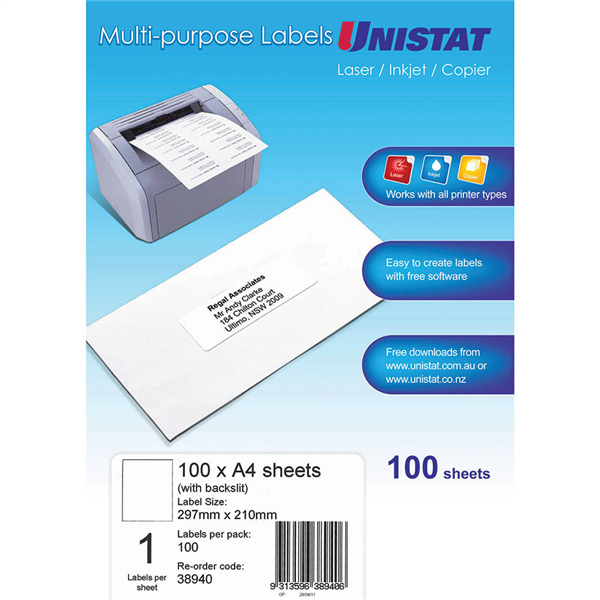 Use Unistat labels in your laser printer, inkjet printer or copier Select from a full range of mailing and parcel label sizes Ideal for addressing and other applications Suitable for laser printers, inkjet printers and copiers Self-adhesive ensures labels stay secure Natural white finish With back slit