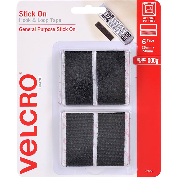 VELCRO BRAND STICK-ON HOOK AND LOOP RECTANGLES 25 X 50MM BLACK PACK 6