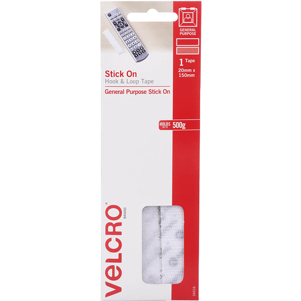 VELCRO BRAND STICK-ON HOOK AND LOOP STRIP 20 X 150MM WHITE