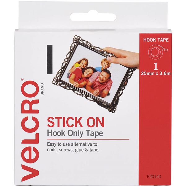 VELCRO BRAND STICK-ON HOOK TAPE 25MM X 3.6M WHITE