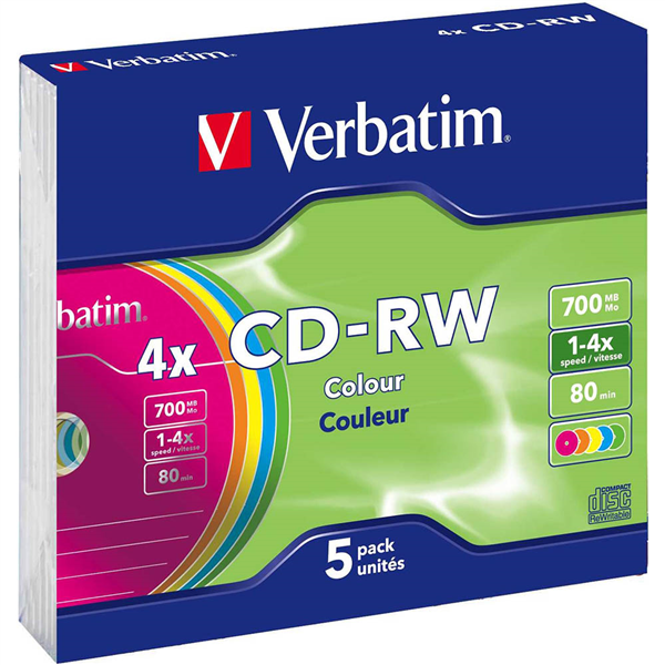 Each pack has a 5 colour assortment of CD-RW that adds simplicity to organise your data and important files with bright vibrant colours such as yellow, blue, purple, pink, and green These discs can be erased and rewritten to multiple times Verbatim 2X-4X CD-RW media is ideal for drag and drop recording using packet writing software such as DirectCD. Look to Verbatim's CDRW discs to store digital images, data back-up and desktop file storage 2X-4X speed rewrite compatibility Rewritable up to 1000 times Read compatible with multi-read CD and DVD drives Vibrant colour media for easy filing