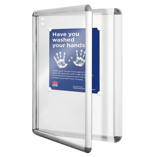 Satin silver aluminium frame, with grey moulded corners Suitable for internal and some external applications under awning The back of the case is sealed with an aluminium sheet as well for added protection Write on the whiteboard background or use magnets to easilysecure notices