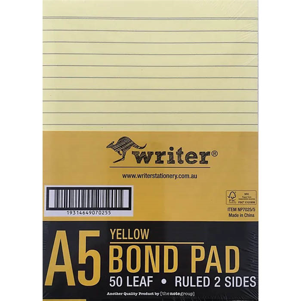 WRITER BOND OFFICE PAD 8MM RULED 70GSM 50 SHEETS A5 YELLOW PACK 5