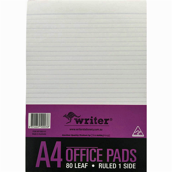 WRITER OFFICE PAD 8MM RULED 50GSM 80 SHEETS A4 WHITE