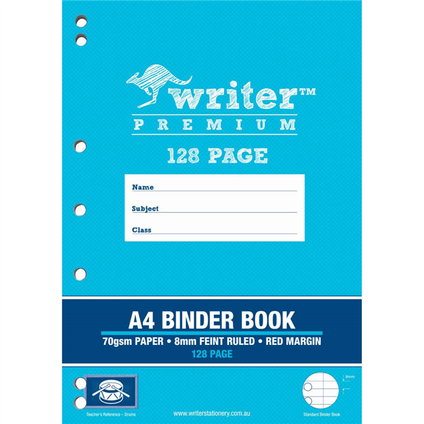WRITER PREMIUM BINDER BOOK FEINT RULED 8MM 70GSM 128 PAGE A4 DRUMS