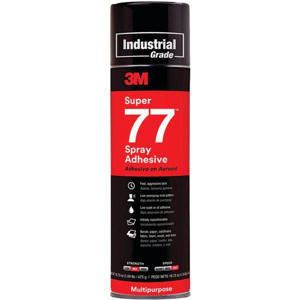 Fast, permanent bond provides fast results to keep projects moving ahead The spray formula is easy to dispense and apply directly onto surfaces and materials where you need Its aggressive tack gives you a high initial grab and sufficient open time to position materials properly High-solids content supports its low soak-in property, giving you time to position parts for best fit This attribute also provides higher coverage than competing spray adhesives and helps create soft, non-dimpling glue lines The combination of fast tack, strong bond, and clean appearance make it ideal for projects all throughout your home or business Forms strong bonds a wide array of materials including paper, cardboard, fabric and cushion foam to plastic, metal, wood and much more 3M Super 77 Multipurpose Adhesive is CARB compliant and eligible for LEED credits Uses for 3M Super 77 Multipurpose Adhesive include: Home improvement and repair projects Attaching fiberglass insulation and drywall corner beads Bonding thin films, foils and fabrics Scrapbooking, picture framing and mounting presentations (photo safe) General decorating and crafts, including wreaths, silk flower arrangements, models and many other projects Ideal for home, office, crafts, and hobbies Finger-touch, targeted control ensures minimal overspray, waste, and clean-up Great spray pattern and low soak-in for high coverage and strong, long-lasting bond High initial grab and aggressive tack helps keep fast-paced projects moving forward Bonds quickly in 15 seconds for fast, permanent results and high productivity Lower viscosity formula than competing brands stays in place with little to no run or migration Repositionable while providing long-lasting strength Ideal on most lightweight materials including foam core board, paper, cardboard, fabric, felt, cork and wood Also bonds metals and plastics including ABS, acrylics, PVC and HP nylons Fast, Aggressive Tack Low Overspray Mist Pattern Low Soak-In of Adhesive Initially Repositionable Clear Quality Performance Acid Free Medium Strength Fast Speed