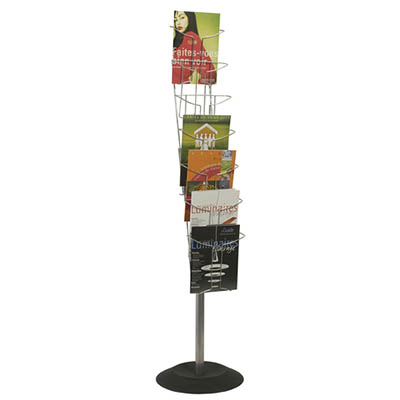 Perfect for reception, trade show, show room areas Robust construction in chrome steel Holds A4 sized documents Heavy base for added stability