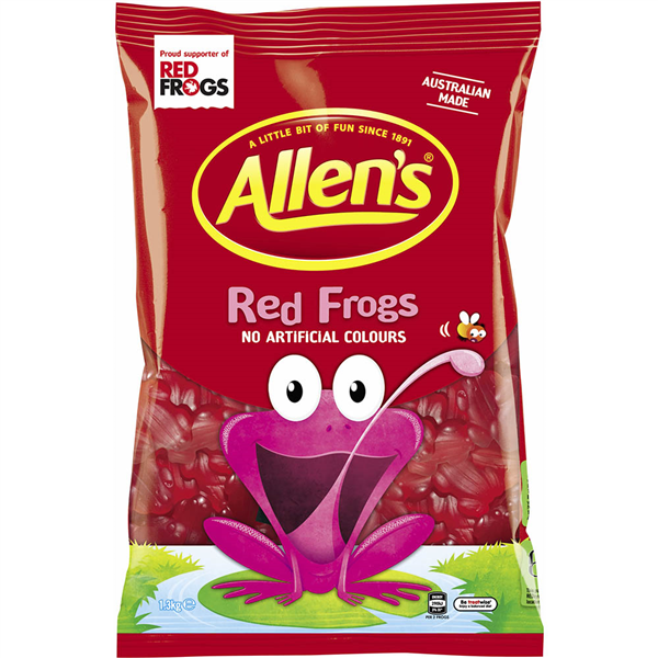 Allen's deliciusly chewy raspberry flavoured Red Frogs Lollies is one of Australia's most-loved lollies This large sharing bag is ideal for your next party or get-together This sharing pack is ideal for a party, event or get-together Each lolly contains a rich yet sweet flavour