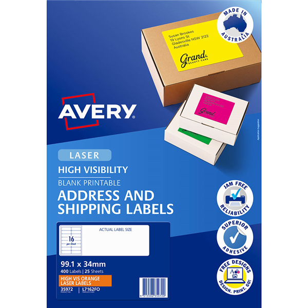Use Avery Fluoro Labels to make something really stand out These fluoro orange labels can be printed with your own message so they are great for labelling parcels and other important mail You can also choose from a range of other promotional labels in more eye-catching colours and shapes Simply use free Avery software to design and print your labels in minutes Fluoro coloured labels make your items highly visible and enable instant recognition Ideal for marking documents, and files that need special attention and for labelling products and packaging for selling or shipping Available in fluoro green, yellow, pink and orange Guaranteed Jam Free printing on laser printers Supported by free Avery templates available at www.averyproducts.com.au