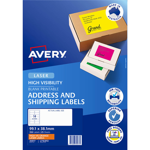 Use Avery Fluoro Labels to make something really stand out These fluoro orange labels can be printed with your own message so they are great for labelling parcels and other important mail You can also choose from a range of other promotional labels in more eye-catching colours and shapes Simply use free Avery software to design and print your labels in minutes Fluoro coloured labels make your items highly visible and enable instant recognition Ideal for marking documents, and files that need special attention and for labelling products and packaging for selling or shipping Available in fluoro green, yellow, pink and orange Guaranteed Jam Free printing on laser printers Supported by free Avery templates available at www.averyproducts.com.au