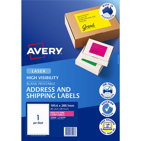 Use Avery Fluoro Labels to make something really stand out These fluoro pink labels can be printed with your own message so they are great for labelling parcels and other important mail You can also choose from a range of other promotional labels in more eye-catching colours and shapes Simply use free Avery software to design and print your labels in minutes Fluoro coloured labels make your items highly visible and enable instant recognition Ideal for marking documents, and files that need special attention and for labelling products and packaging for selling or shipping Available in fluoro green, yellow, pink and orange Guaranteed Jam Free printing on laser printers Supported by free Avery templates available at www.averyproducts.com.au